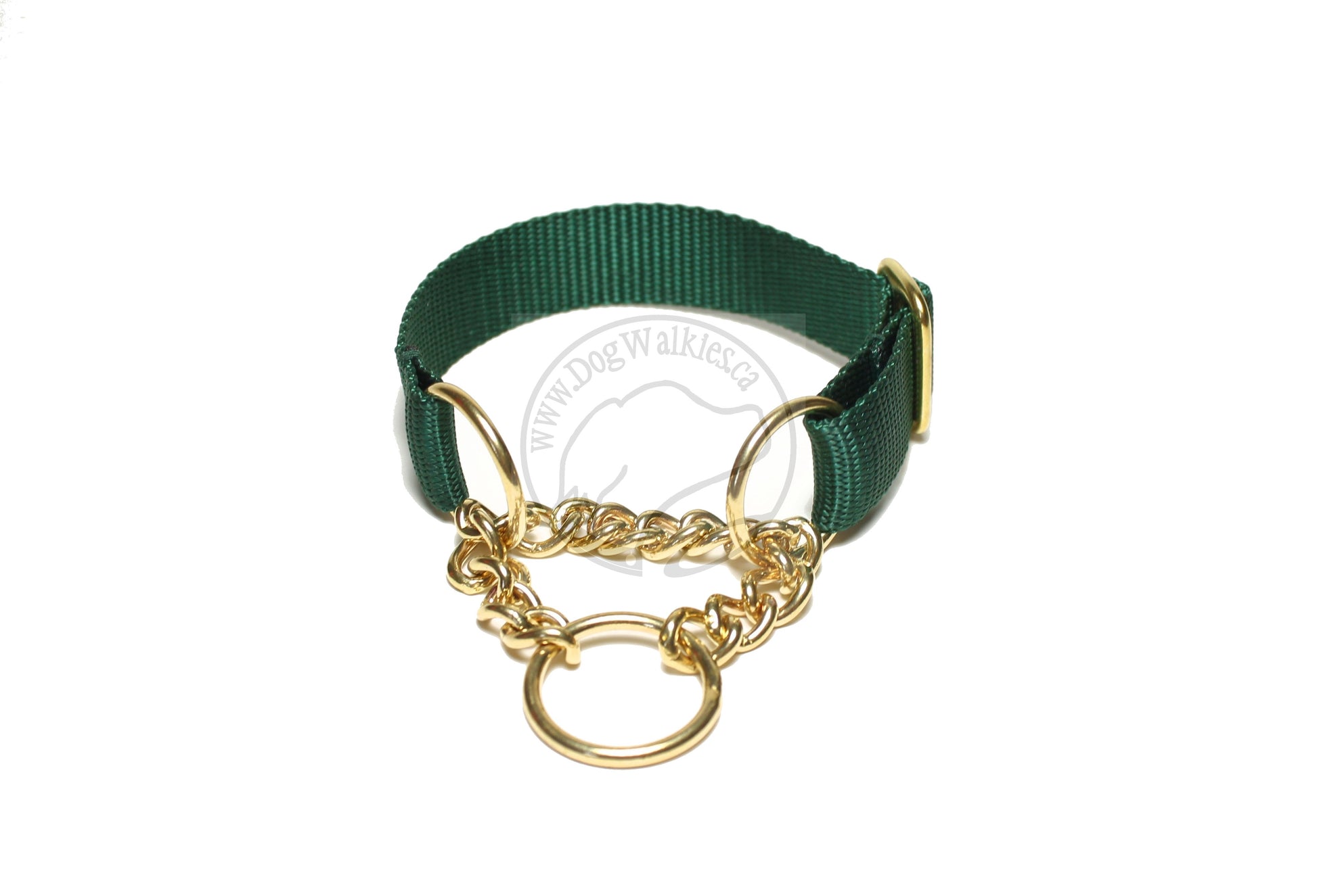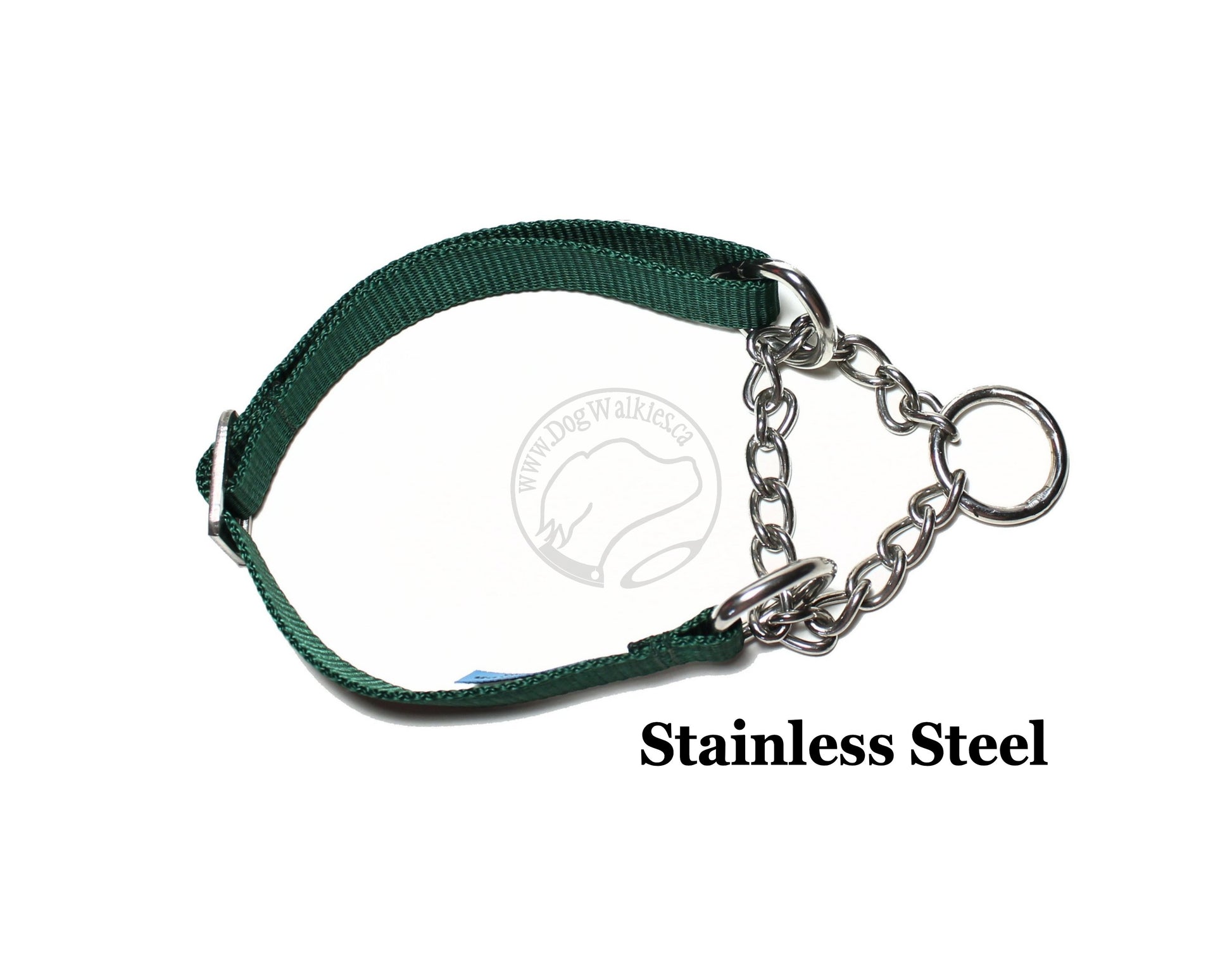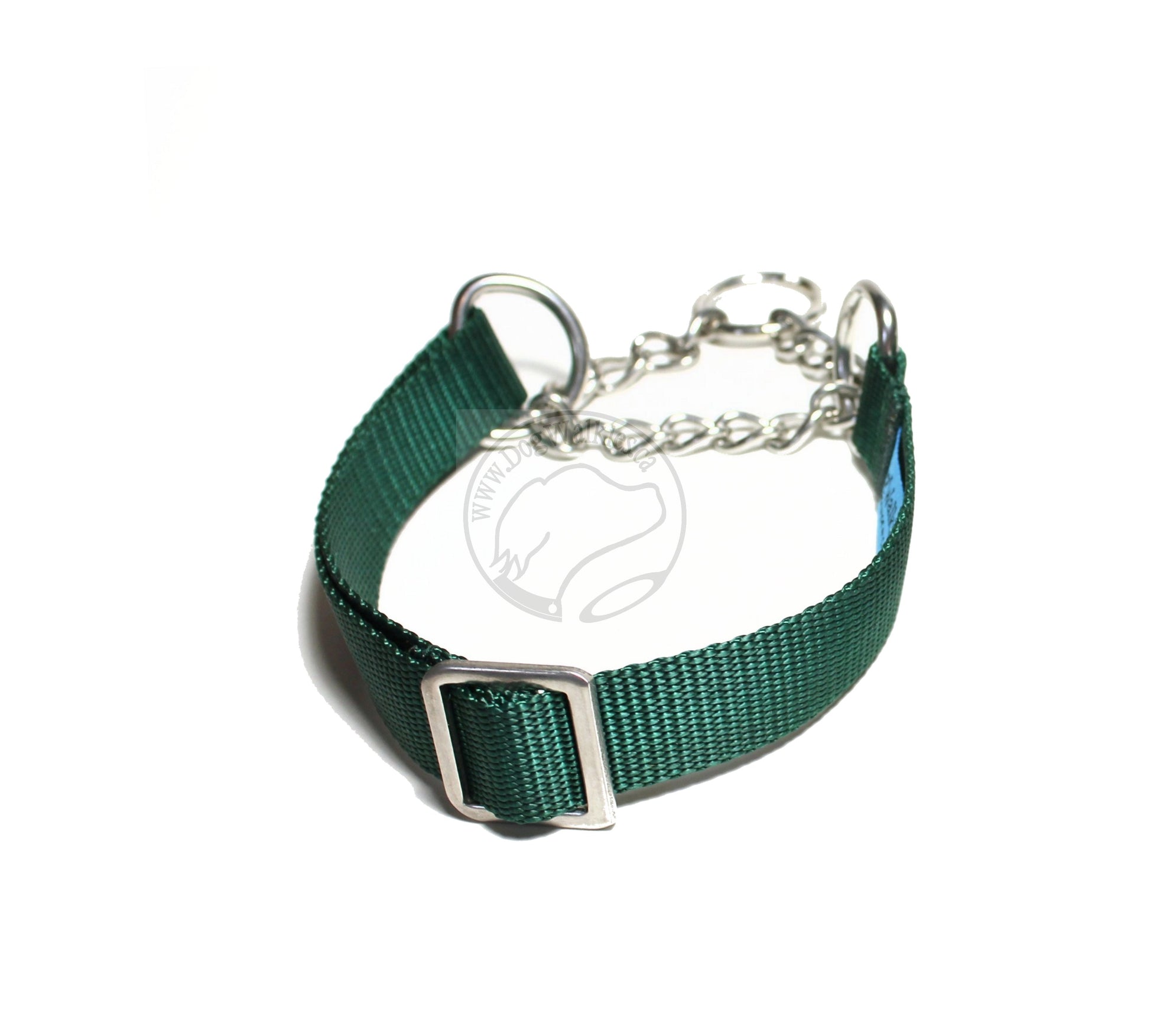 CHAIN MARTINGALE: Has a chain loop that, when pulled, will tighten a limited amount to prevent slipping out (or backing out) of the collar. Put on over the head and adjust to fit. Chains are metal and can mark light fur; it washes off easily. Head and neck of dog need to be measured for correct sizing. Three types of hardware are available: