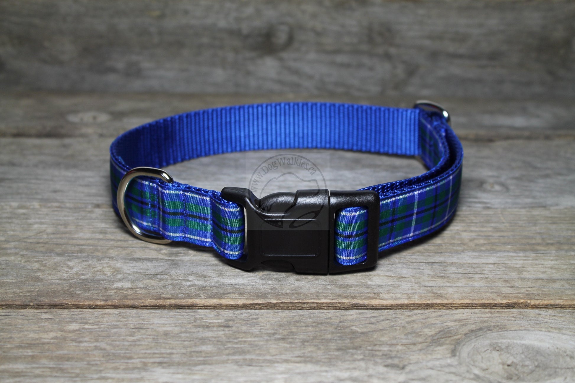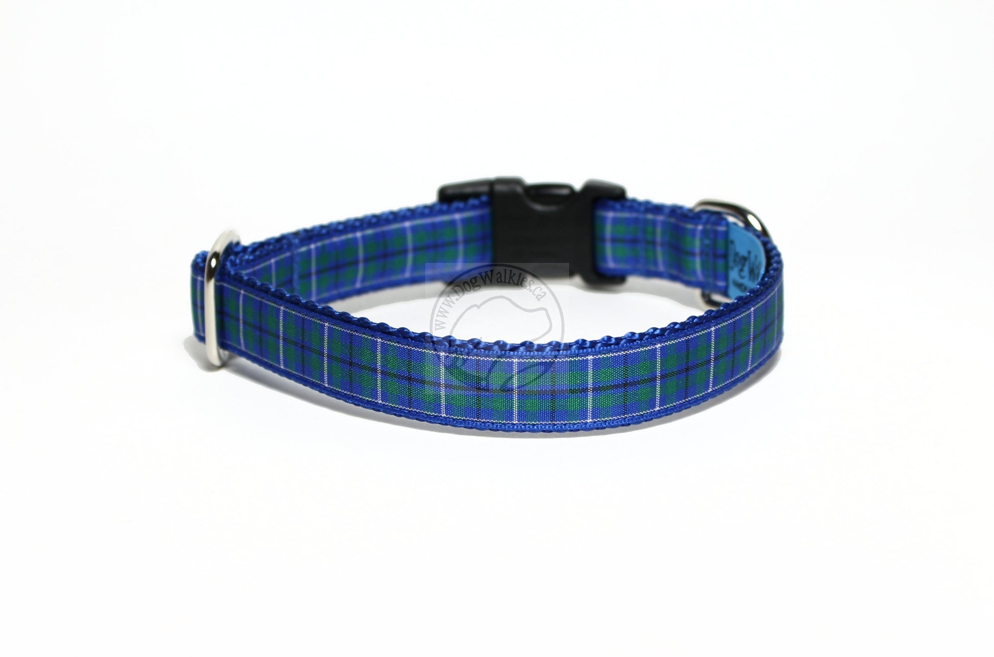 Ancient Douglas tartan is a beautiful cobalt blue with bright Kelly green. It is matched with the royal blue webbing back for strength and style. Matching leashes are also available here.