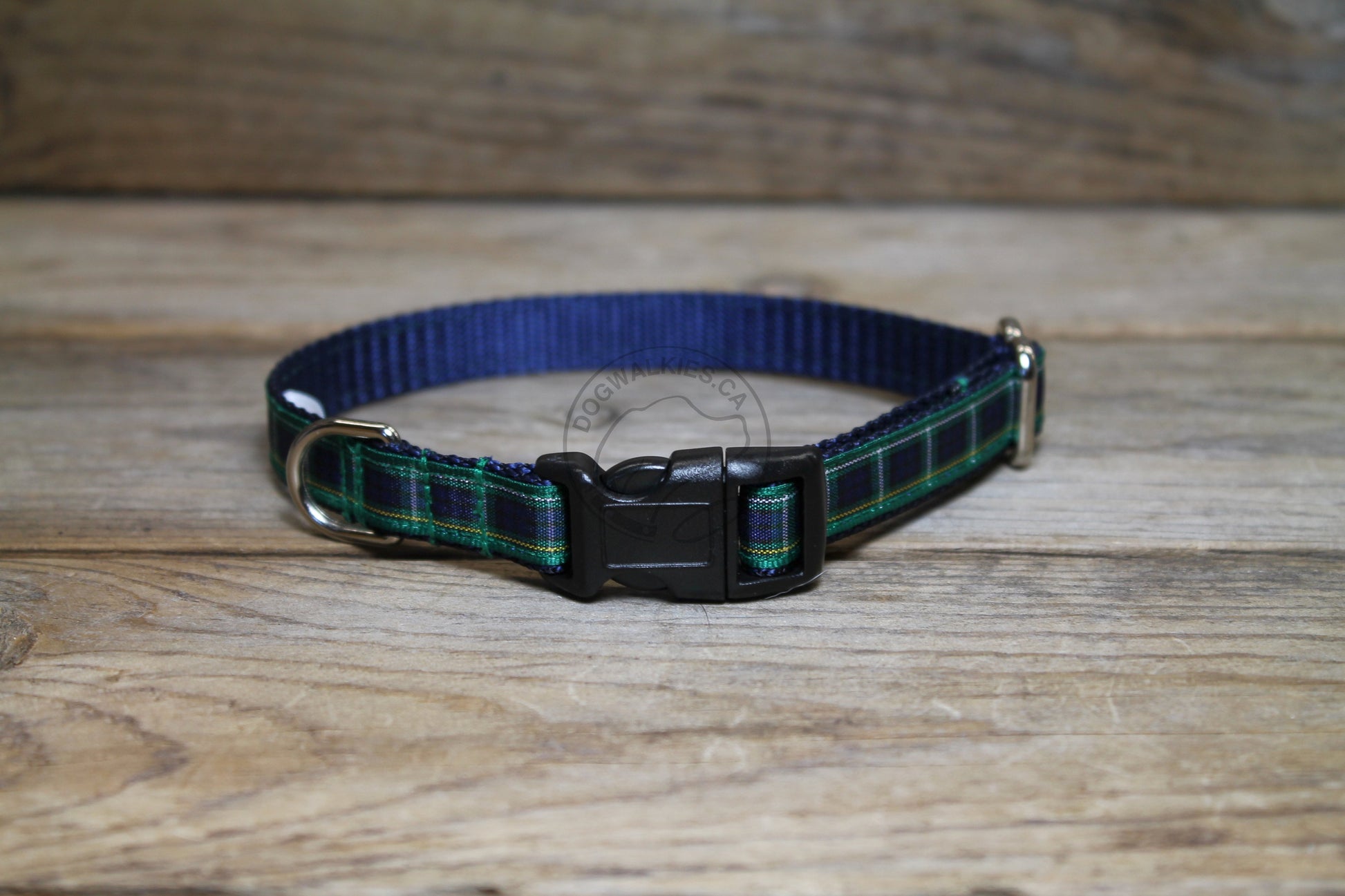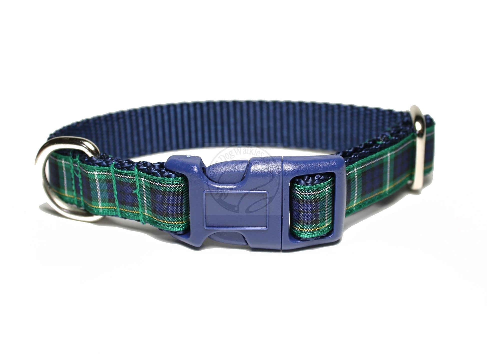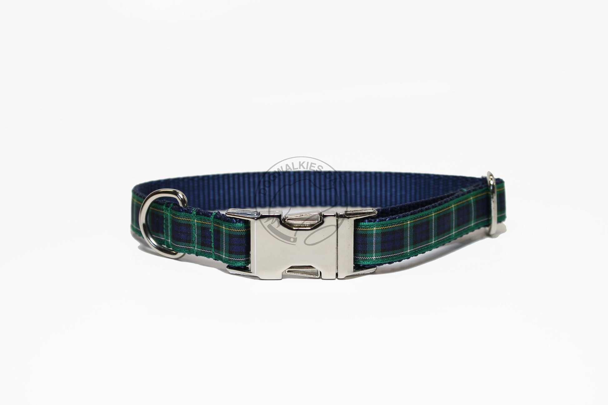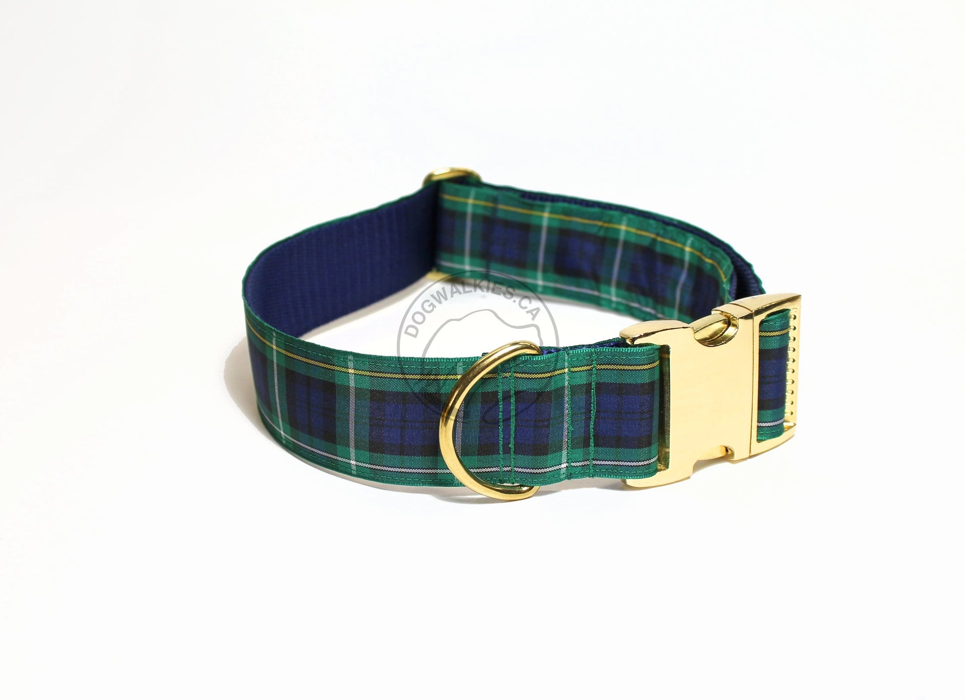 Lovely deep blue and bold green framed in gold and white. Paired with a deep navy webbing back. The Campbell tartan is very striking. Matching leashes are also available here.