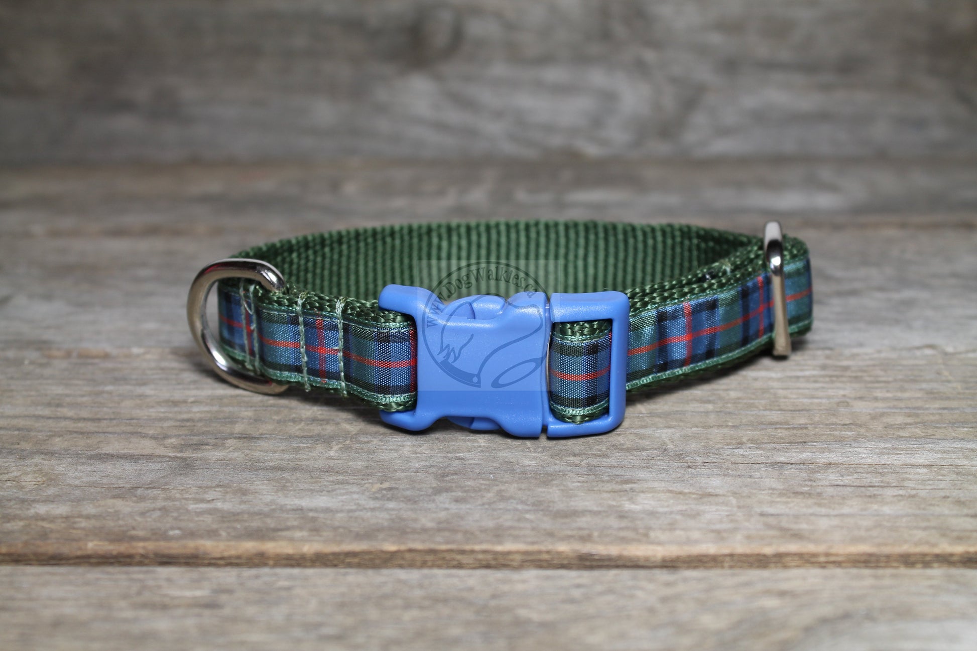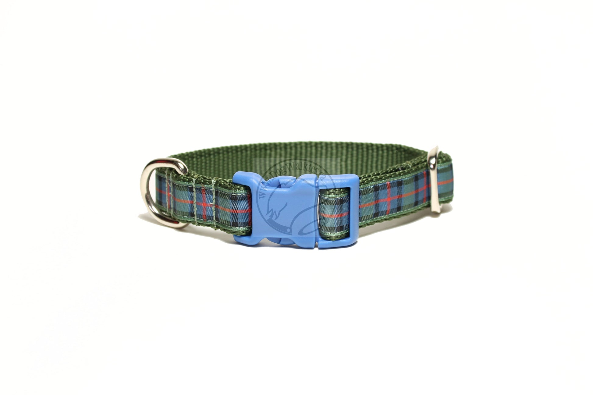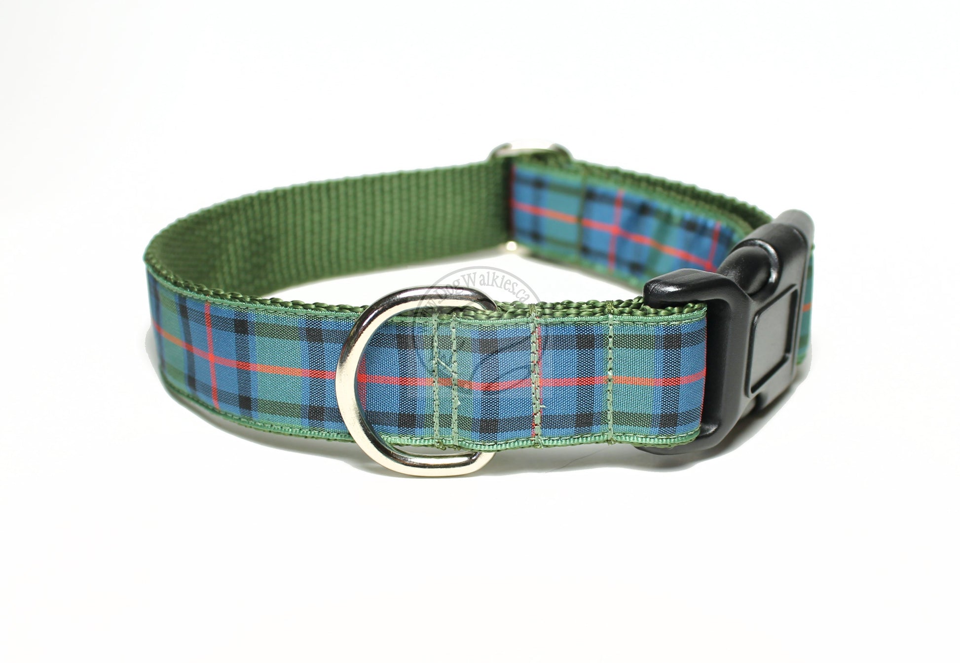 This dusty heather green and sky blue, this lovely tartan is truly beautiful. I have matched it on olive green webbing to keep with the earthy colours. Matching leashes are also available in this link.