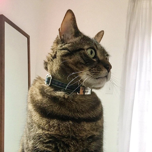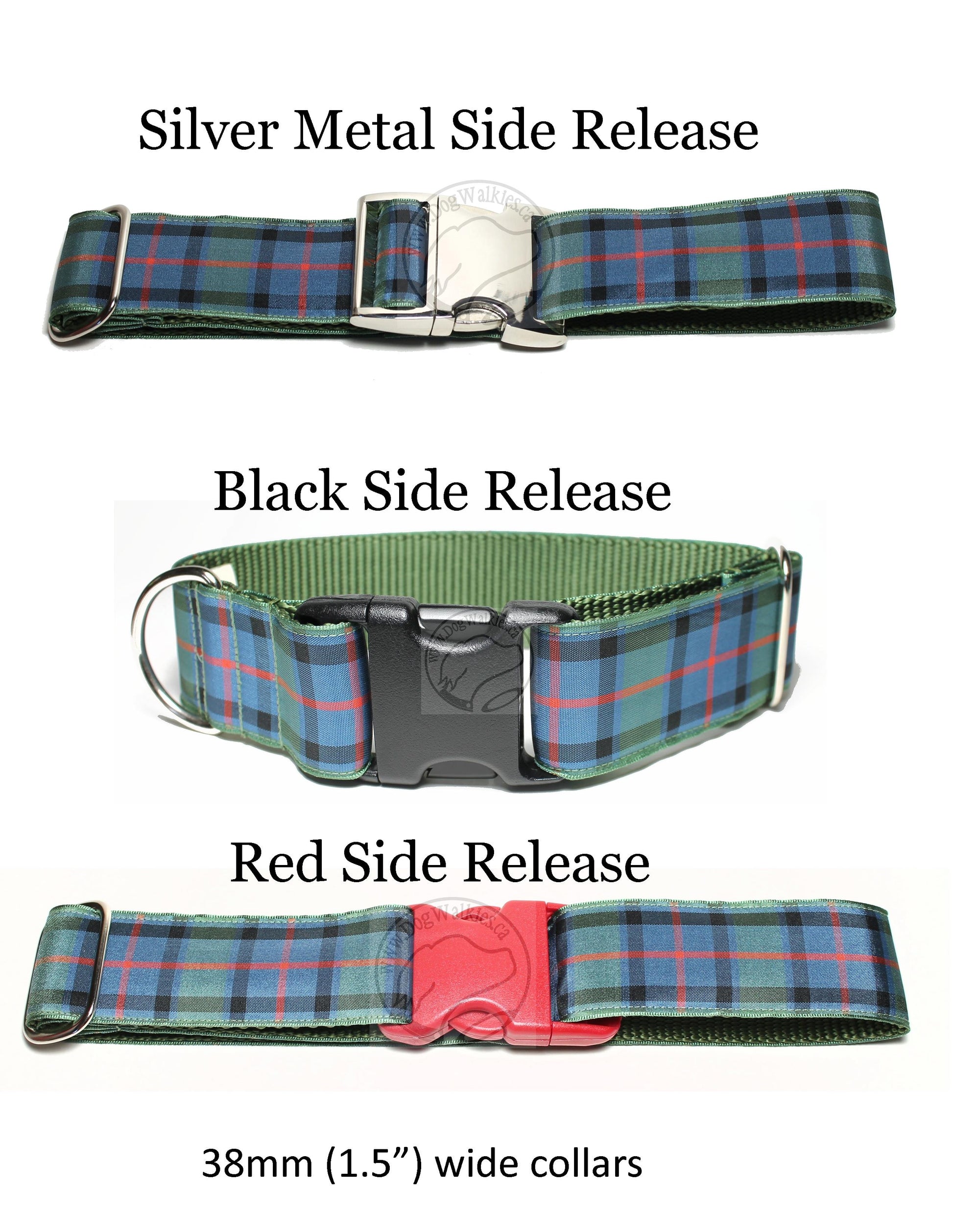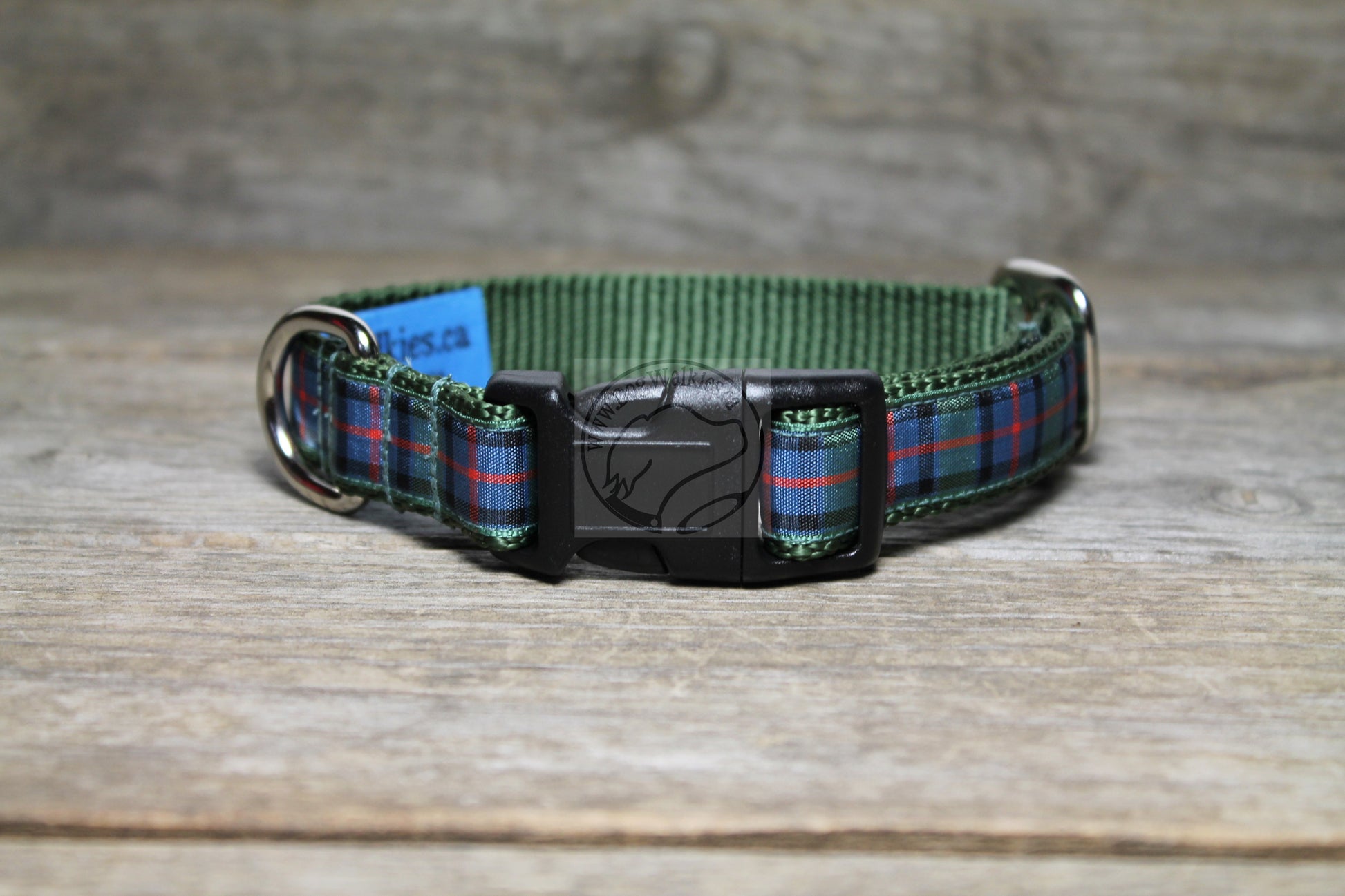 This dusty heather green and sky blue, this lovely tartan is truly beautiful. I have matched it on olive green webbing to keep with the earthy colours. Matching leashes are also available in this link.