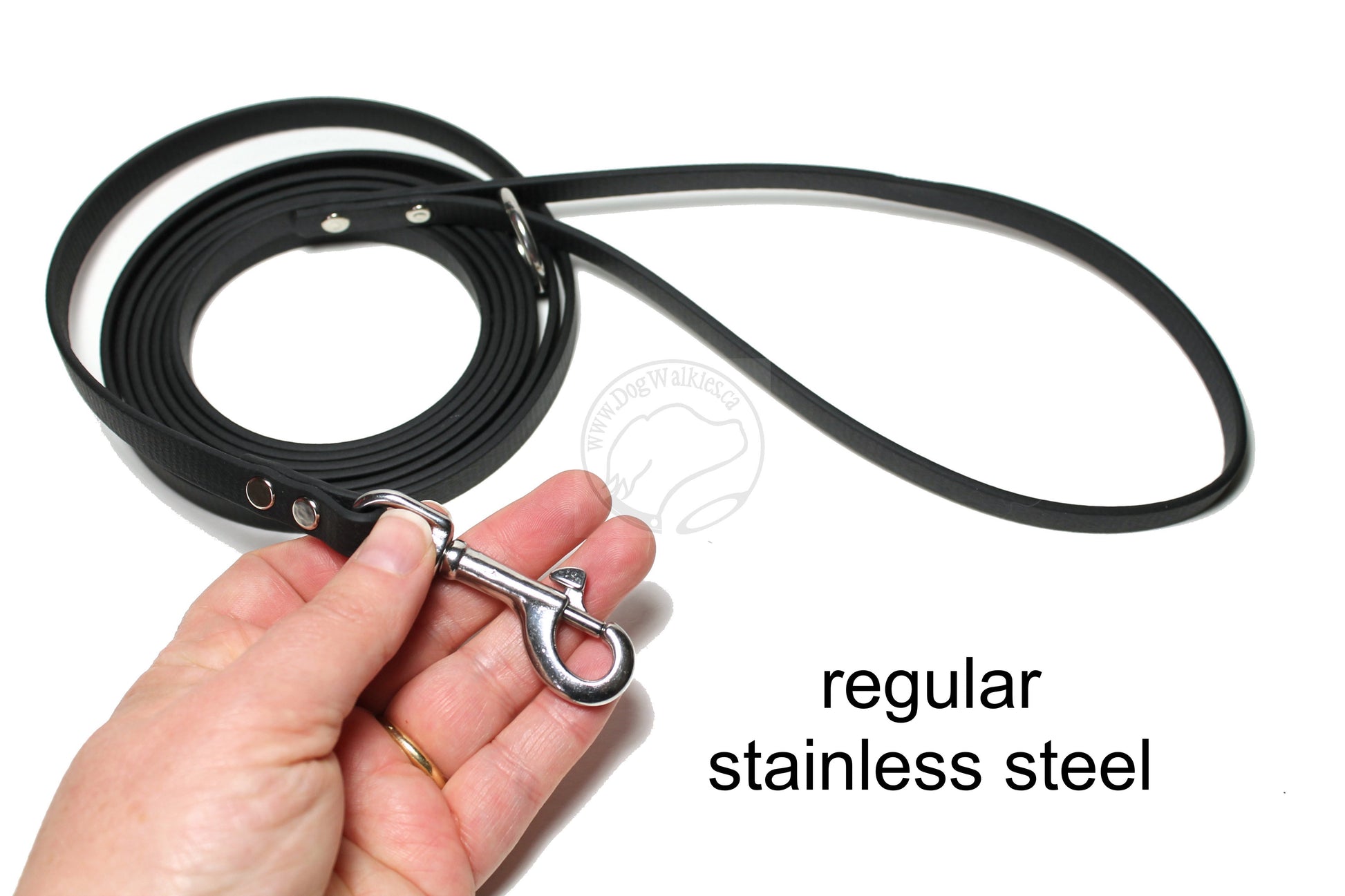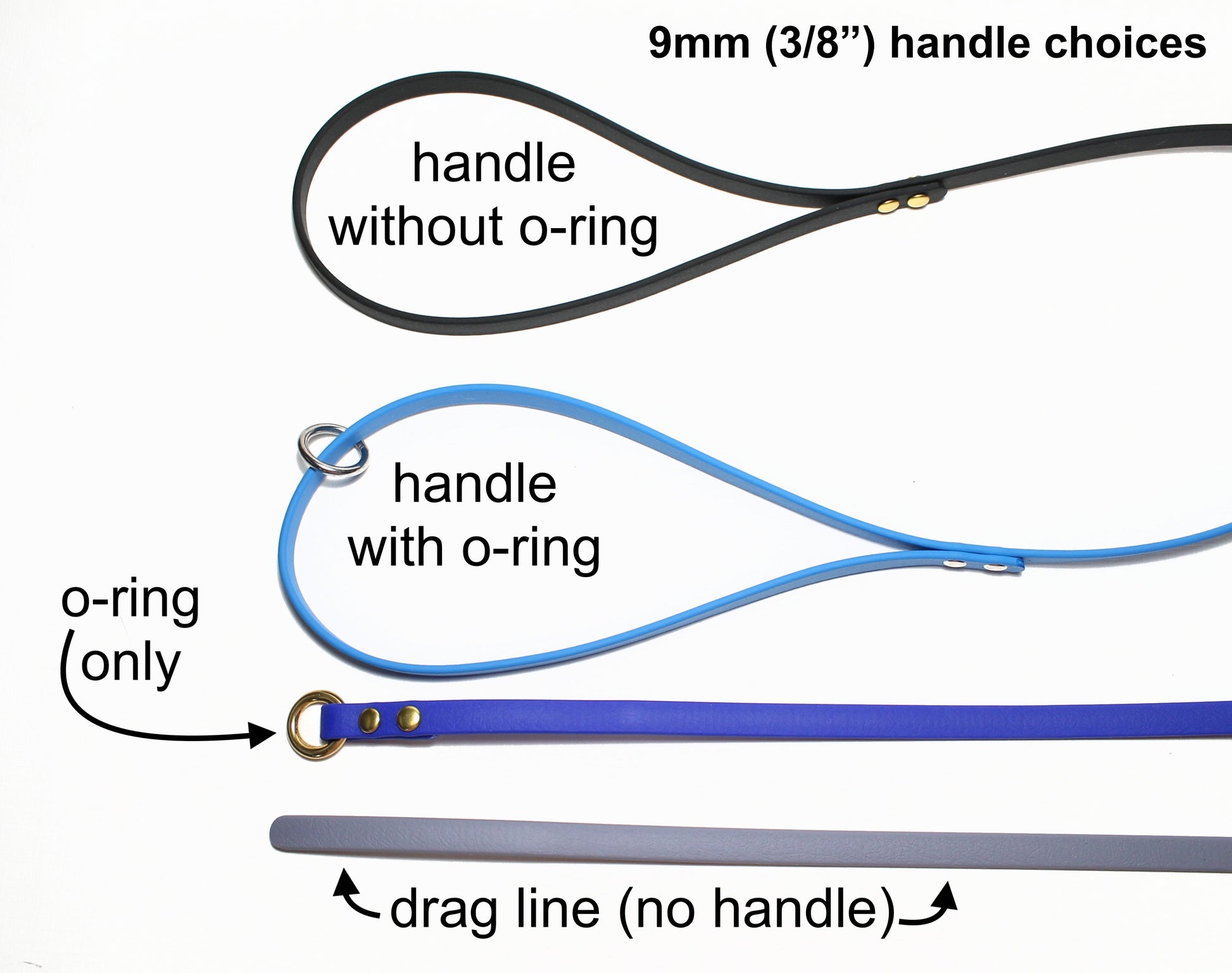 With handle, with O-ring, or without handle (use as drag line). The measure is from the one end to the other; the entire length, including snap and/or handle. Our extra thin long line leashes are made with Genuine ST Beta BioThane - 9mm (3/8") wide. They have a breaking strength about 74kg or 160lbs, so not great for stronger pullers/animals. We hand make everything to each individual order and the pictures here are just samples. Hardware aren't always as pictured. Feel free to contact me for photos of exact hardware I will use on your leash.