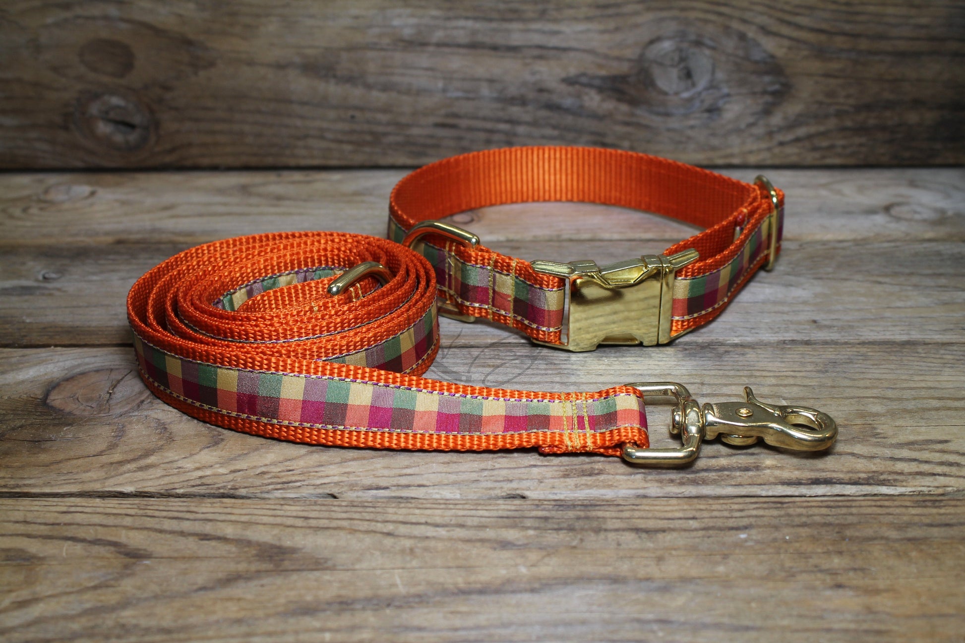 Brilliant Fall Plaid! This tartan dog collar is a vibrant mix of autumn colours; orange, burgundy, yellow and green. Very festive plaid and is only available in 2 widths. Matching leashes are available here.